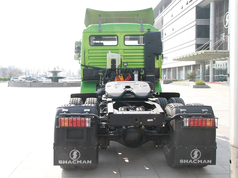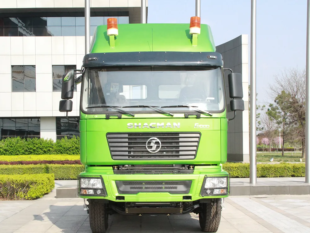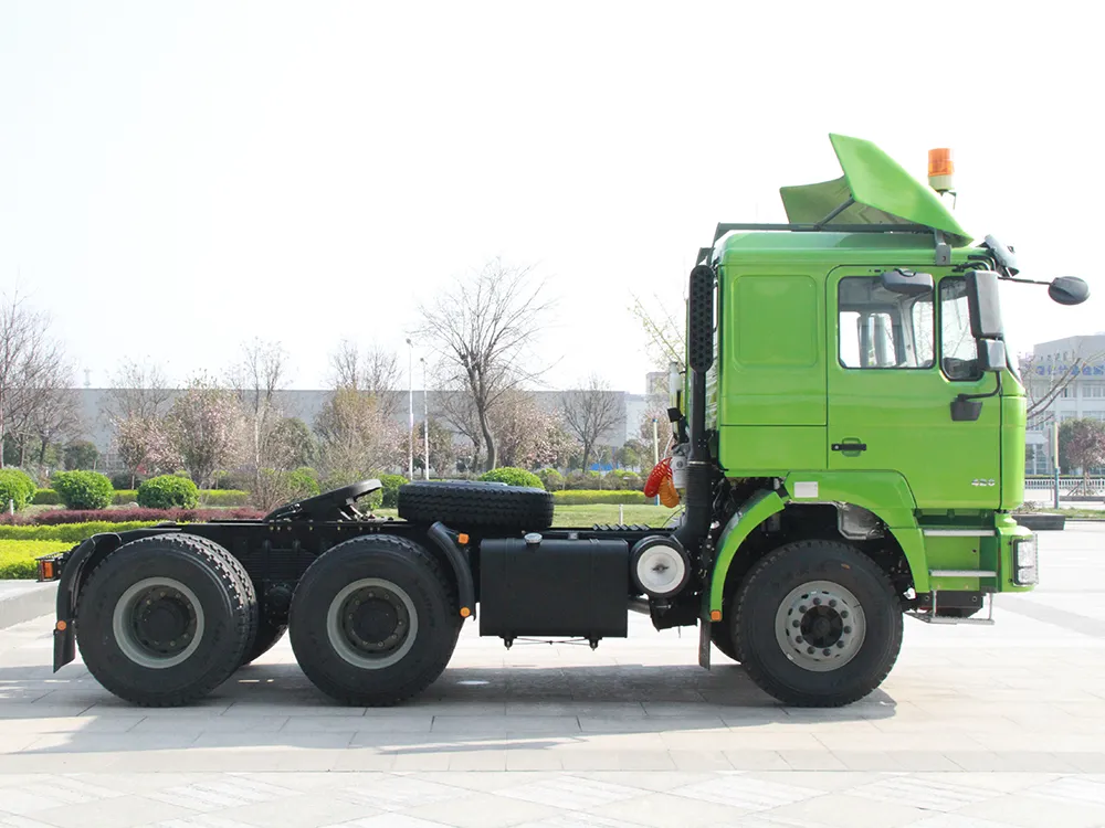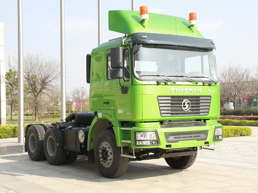هذه صورة لشاحنة جرار SHACMAN F2000 بقوة 420 حصاناً تتميز بتصميم خارجي أخضر نابض بالحياة مع مصابيح تحذير مزدوجة مثبتة على السقف وعاكس هواء هوائي ديناميكي. يجعلها تكوين 6×4 وتصميمها الأمامي الحديث مثالية لعمليات النقل الثقيل في جميع أنحاء العالم.