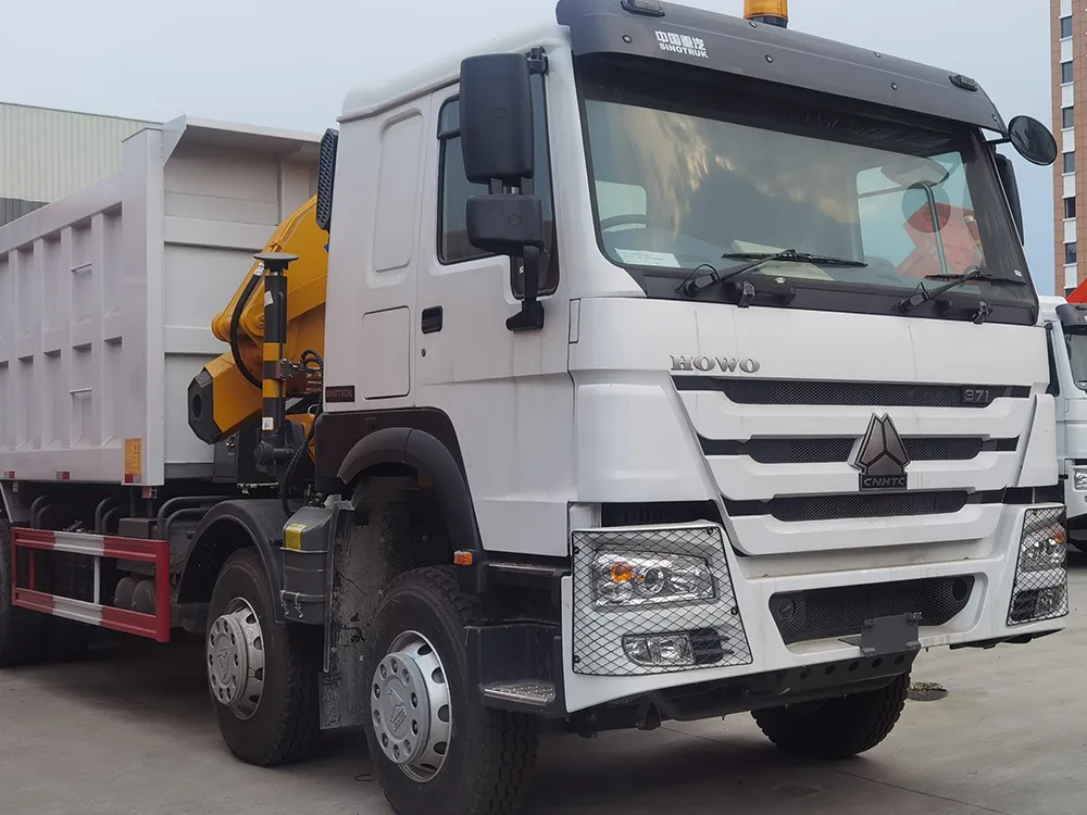 HOWO-8×4-371-Grue jaune-blanc avec feux de signalisation, protection des phares, grue à benne basculante et à flèche repliable Description :