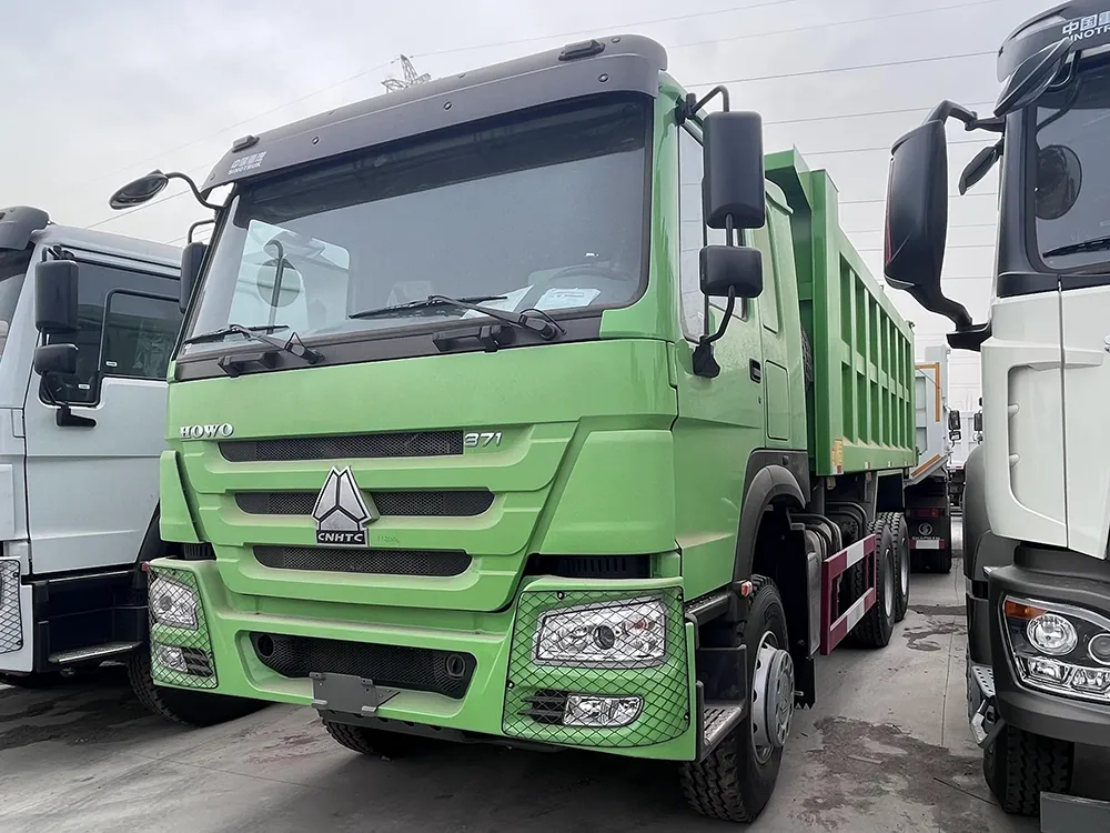Green Howo 371hp 6×4 Dump Truck is mainly used to work in construction site or mining, transport dinas, earth, mineral, etc. The headlight protective cover increase the safty, and all these configurations are costumizable.
